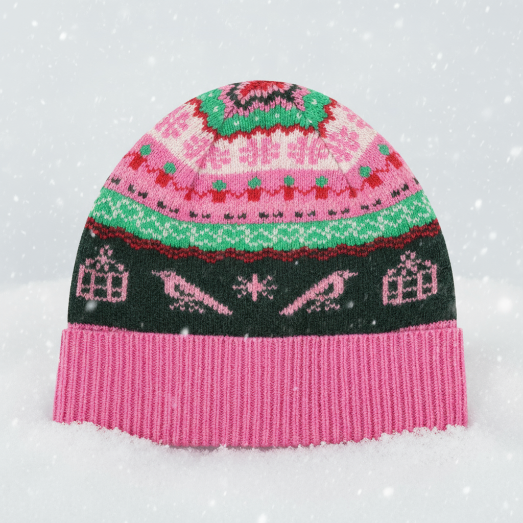 A modern take on Fairisle. Designed in Cardiff and knitted in Scotland from 100% cruelty-free wool, this cosy beanie blends heritage craft with a feminist twist.