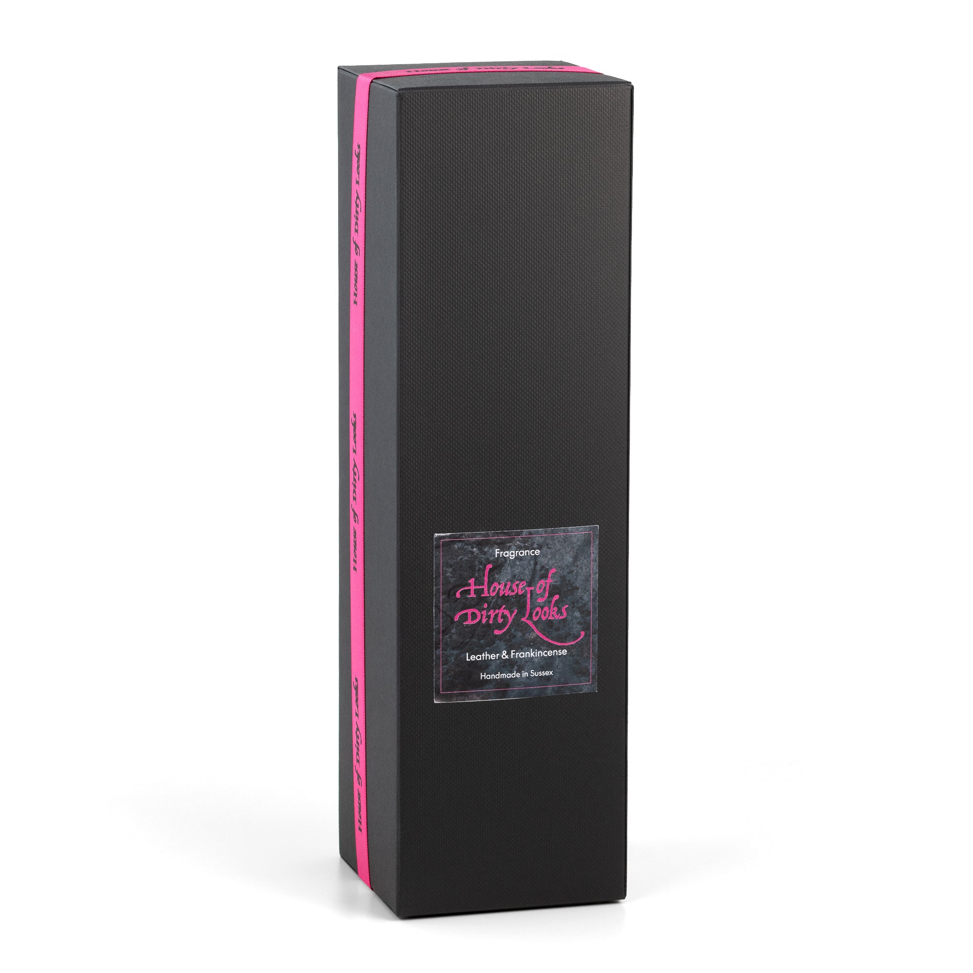 Discover the daring essence of the bespoke 'House of Dirty Looks' fragrance, crafted by Moores Home and Garden exclusively for the Barbican Dirty Looks exhibition. This reed diffuser combines bold notes of frankincense and leather, wrapped in a sleek box and finished with a striking printed pink ribbon.