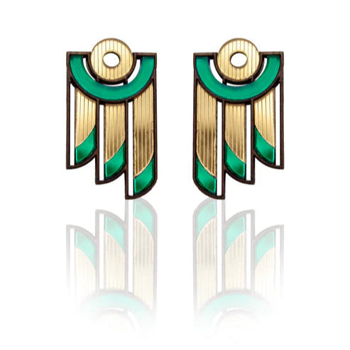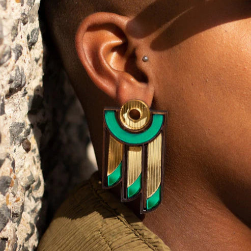 Materials: the pieces are all hand made from walnut wood (this for the frame and structure of the piece), acrylic (for the colourful inserts) and plywood (this is the base of the piece). The earring backs are all Sterling Silver.