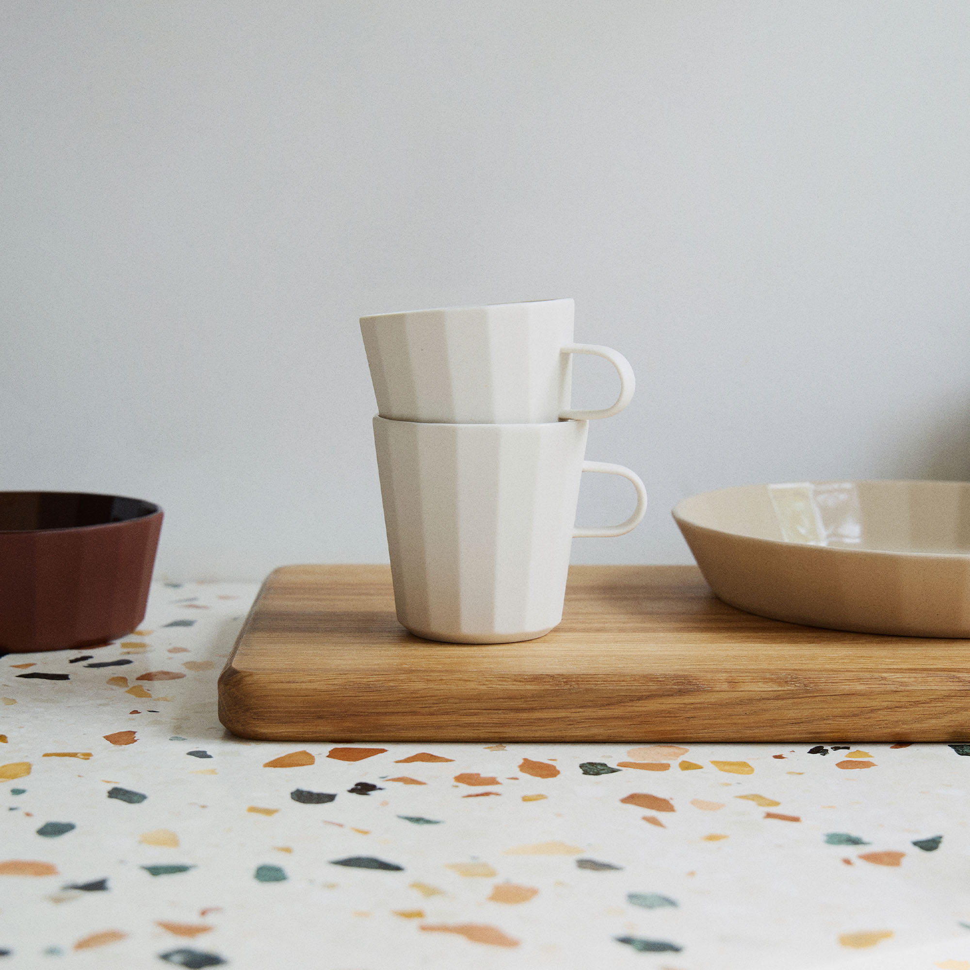 Oven safe and versatile in use, the collection is offered in milk, cacao, and oatmeal finishes, spanning small dishes, plates, bowls, mugs, and serveware.