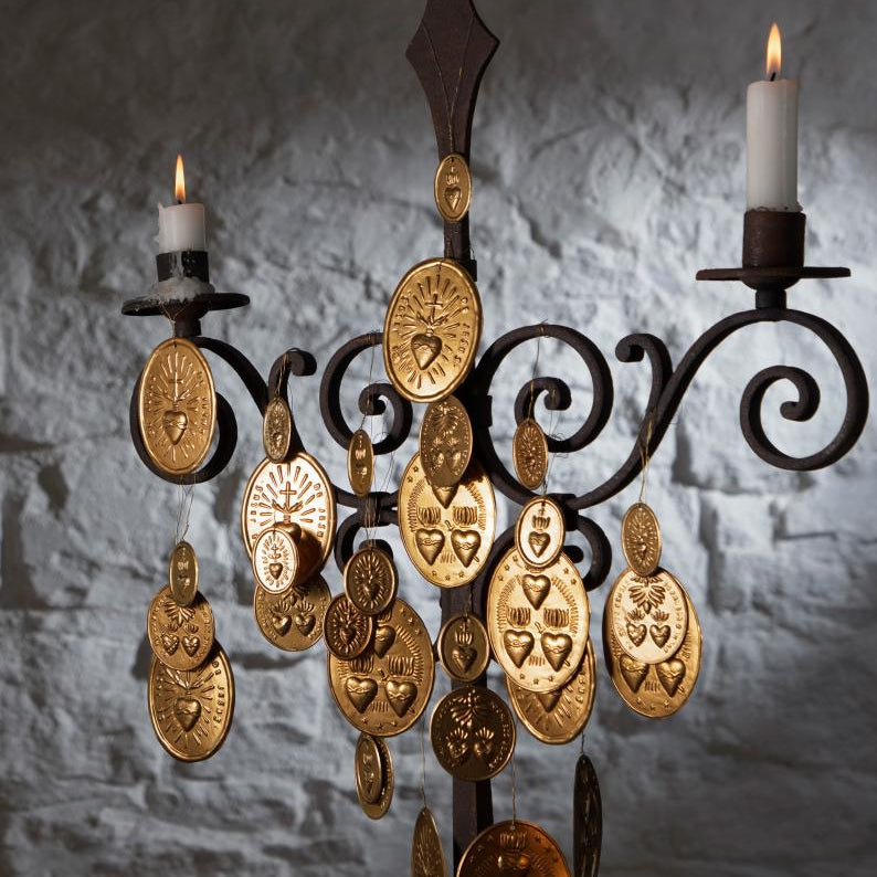 Golden disc Milagros embossed with three naive hearts, suspended from twisted wire for easy hanging. These traditional Spanish folk charms symbolise miracles and gratitude, perfect for displaying, gifting, or decorating your table.