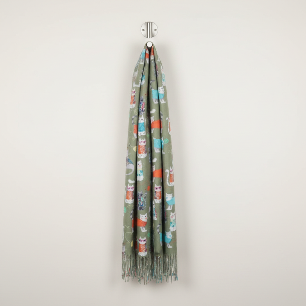 Stay warm with this playful cat scarf in olive green, featuring cats dressed to perfection wearing colourful jumpers and glasses.